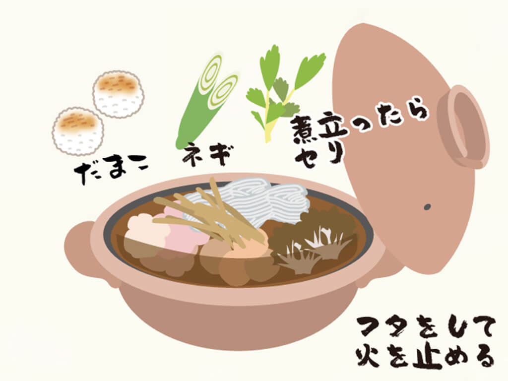 4. だまこ、ねぎを入れ、煮立ったらせりを入れてフタをして、火を止めます。