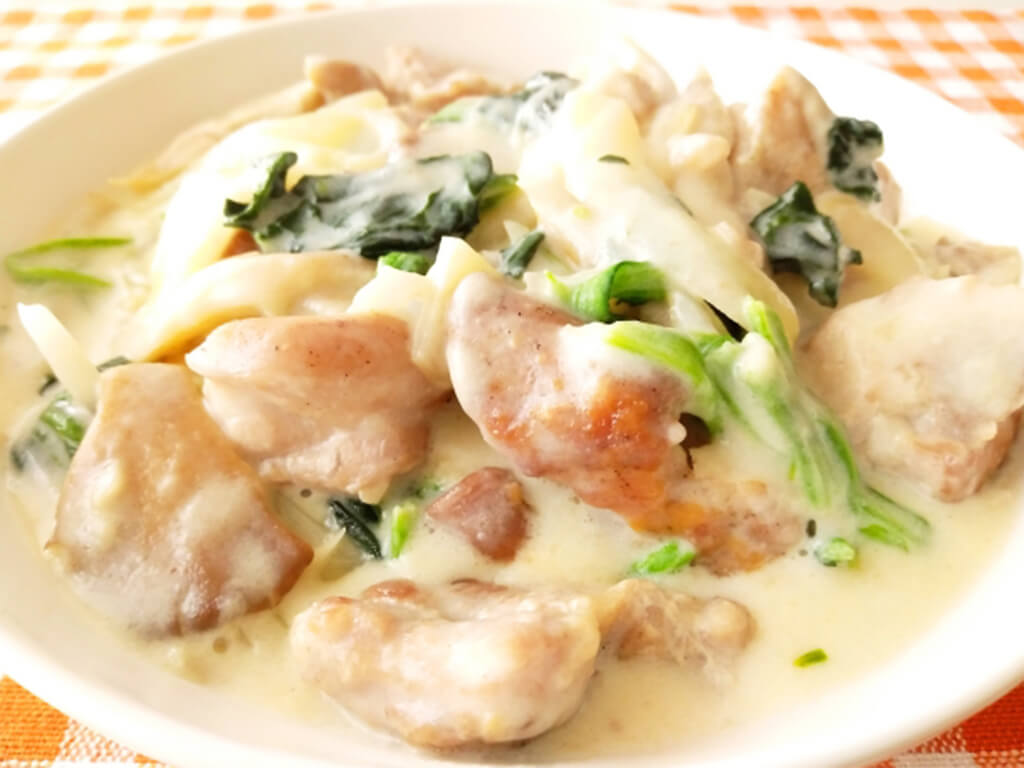 たくさんの野菜とむね肉の旨みを牛乳、コンソメなどで煮込んでクリーミーに。バターを加えるとコクがアップ。