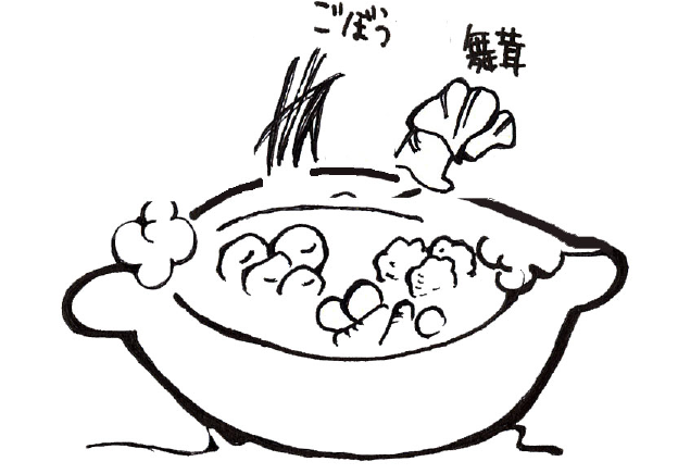3. 下ごしらえしておいたささがきごぼう、舞茸を入れ、鍋にフタをして一煮立ちさせます。