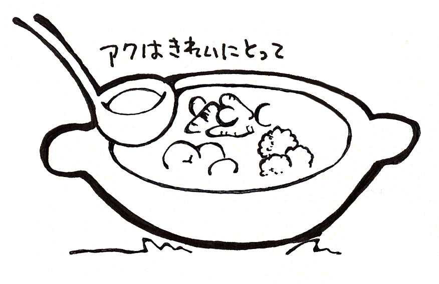 2. 一煮立ちしたらアクを取ります。正肉、ミンチに火が通ったら鍋っこしょうゆを入れます。