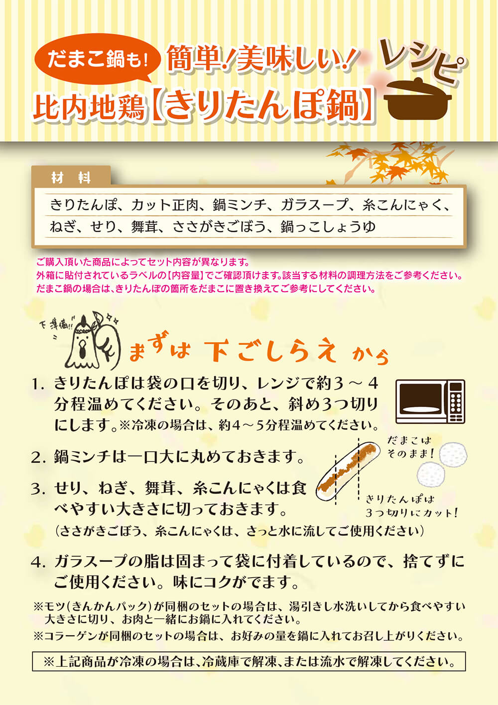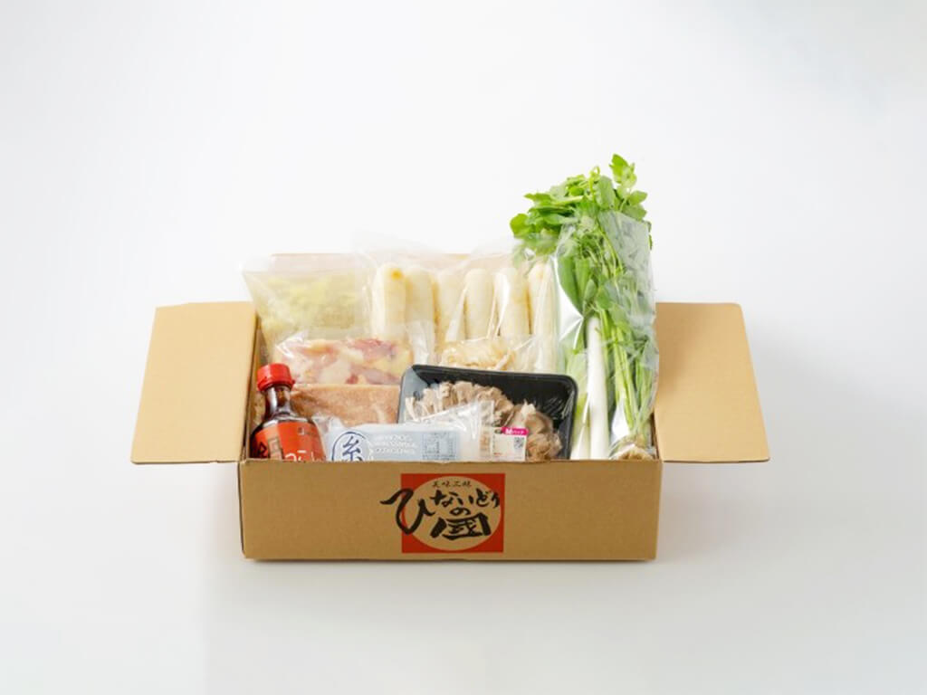 きりたんぽ3本、だまこ10個、比内地鶏カット正肉200g、比内地鶏がらスープ1000ml、比内地鶏ミンチ100g、比内地鶏きんかん卵管200g、糸こんにゃく180g、野菜(長ねぎ200g、せり100g、舞茸100g、ささがきごぼう100g)、鍋っこしょうゆ200ml