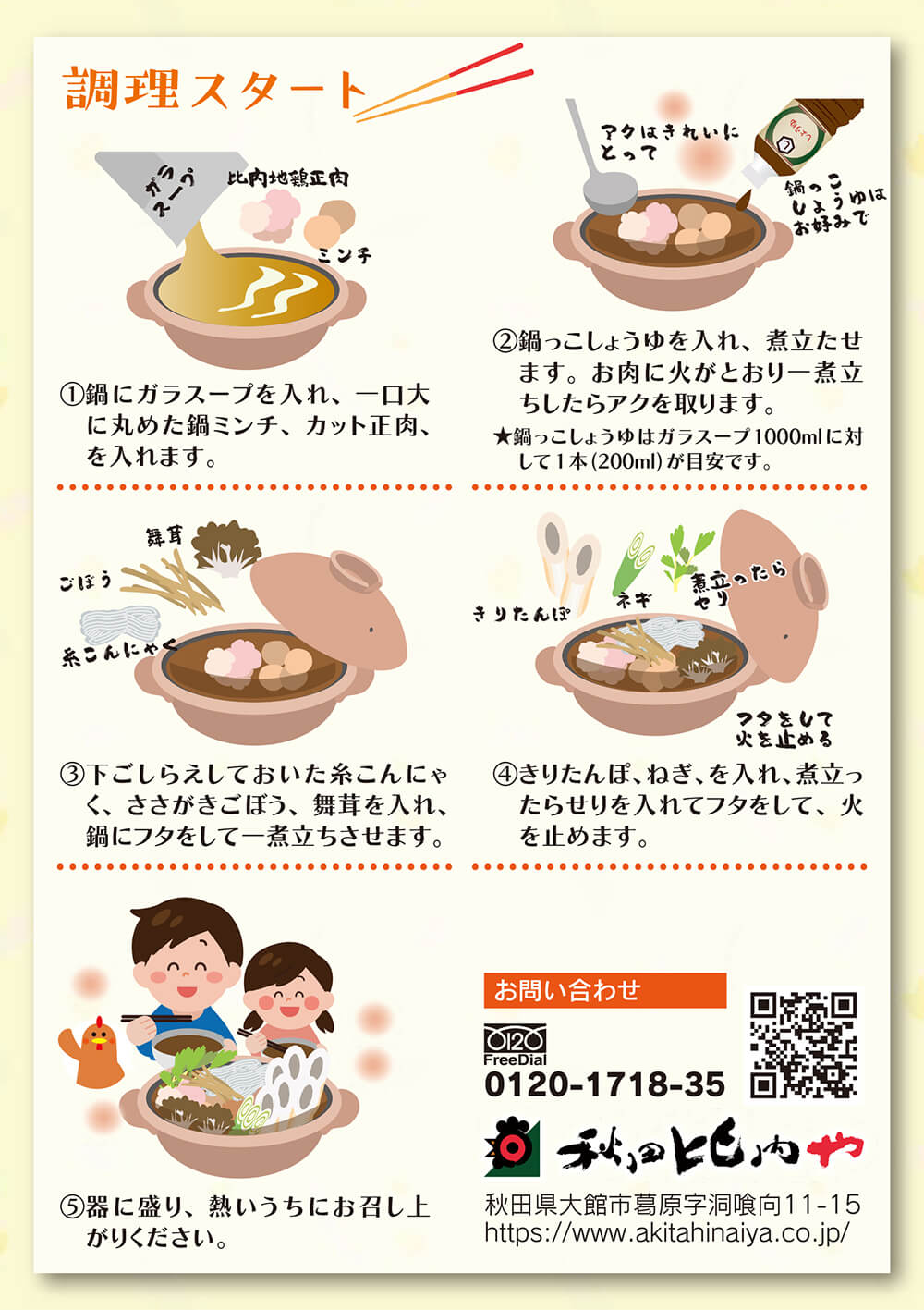 【鍋っこしょうゆ】しょうゆ(秋田県製造)、みりん、鶏がらスープ、食塩、清酒、こんぶエキス、小麦発酵調味料、酵母エキス、(一部に小麦・大豆・鶏肉を含む)