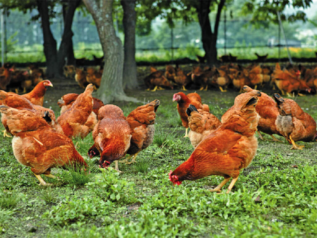 油脂抜きの穀物飼料を中心に与えますが、牧草や虫など自然の餌も豊富に食べて育ちます。